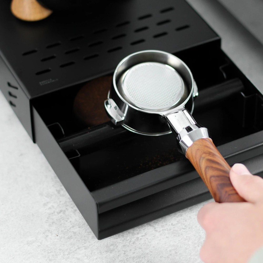 Dankzij de ventilatiegaatjes op de bovenkant veeg je gemalen koffie eenvoudig weg en voorkom je dat gebruikte koffie pucks beschimmelen. De rubberen uitklopbar is stevig bevestigd en vangt zowel de klappen als het geluid op bij het uitkloppen van je portafilter.